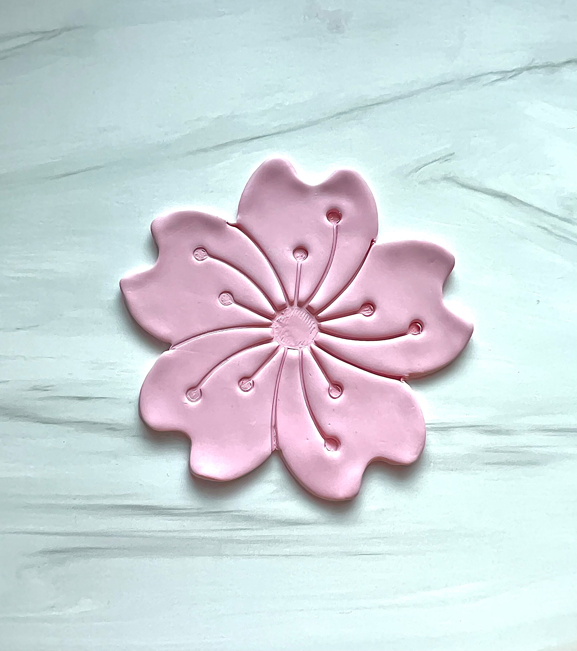 You always want to use a ceramic tile or a piece of glass under your clay, making sure to press the clay onto the tile or glass before using your cutter to avoid having the clay stick to your cutter.
